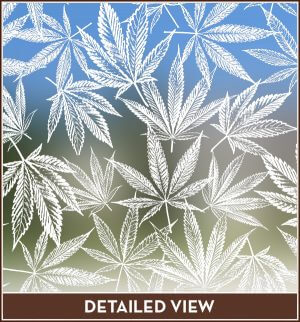 The adhesive-free vinyl cling film features a variety of frosted etched glass cannabis leaves over a clear background, adding a decorative element without blocking the view. Is easy to trim to size and a cinch to apply.
